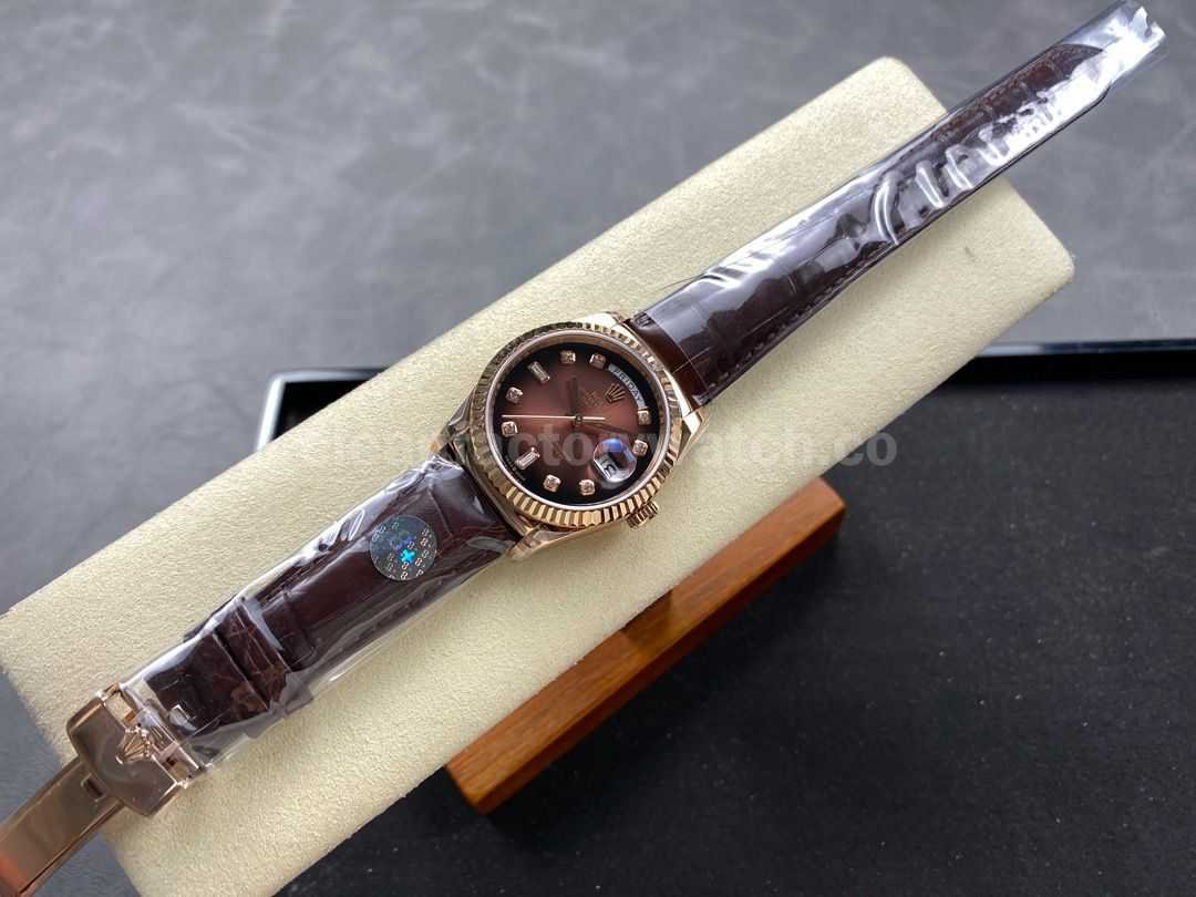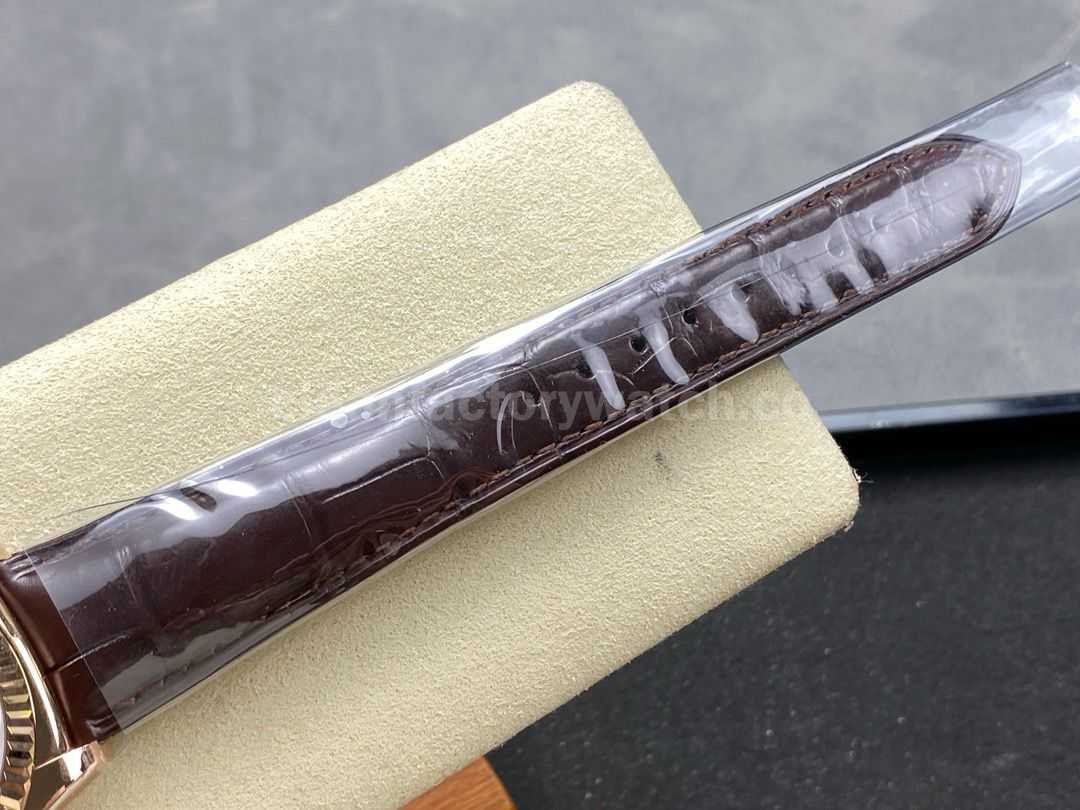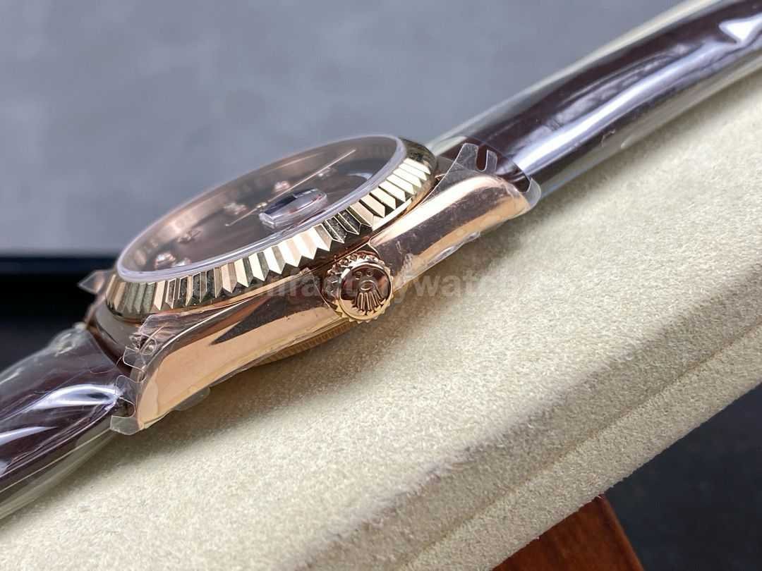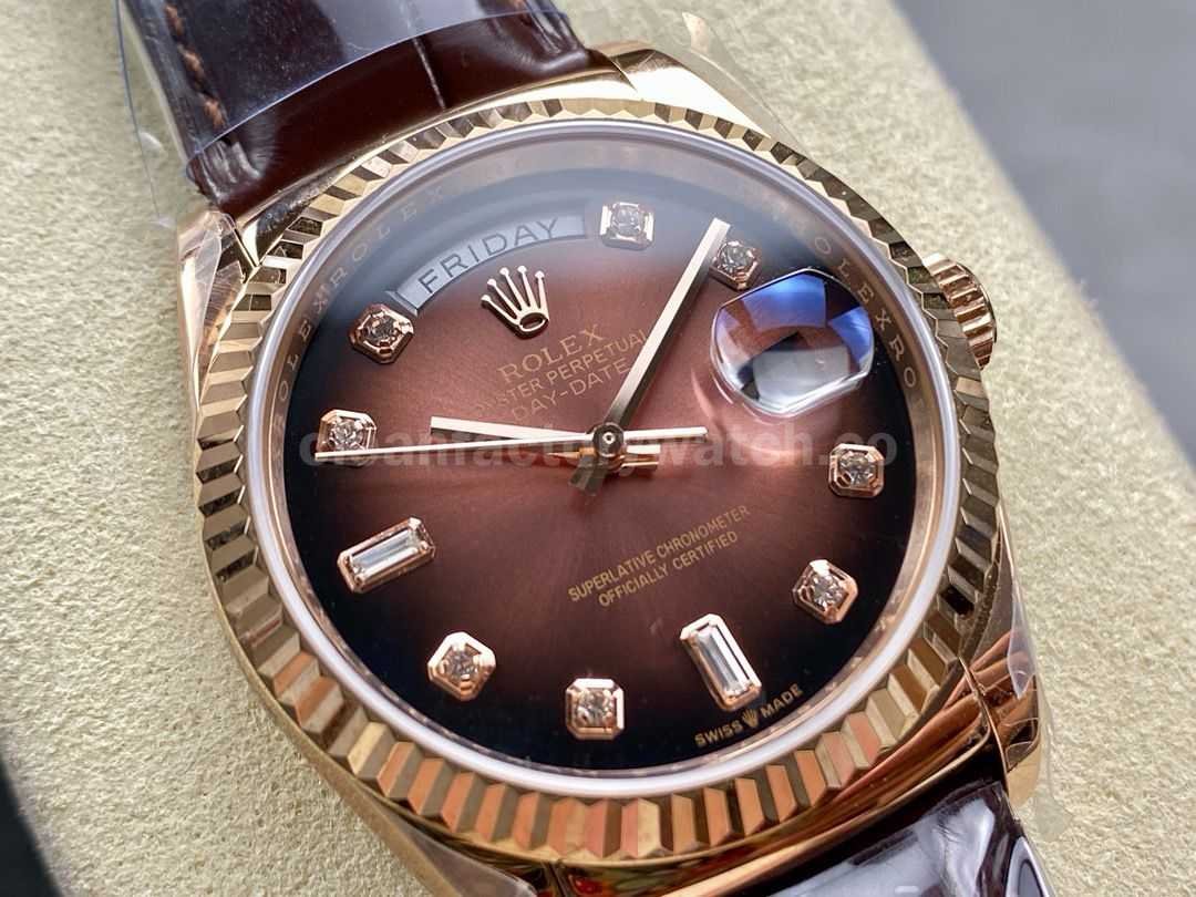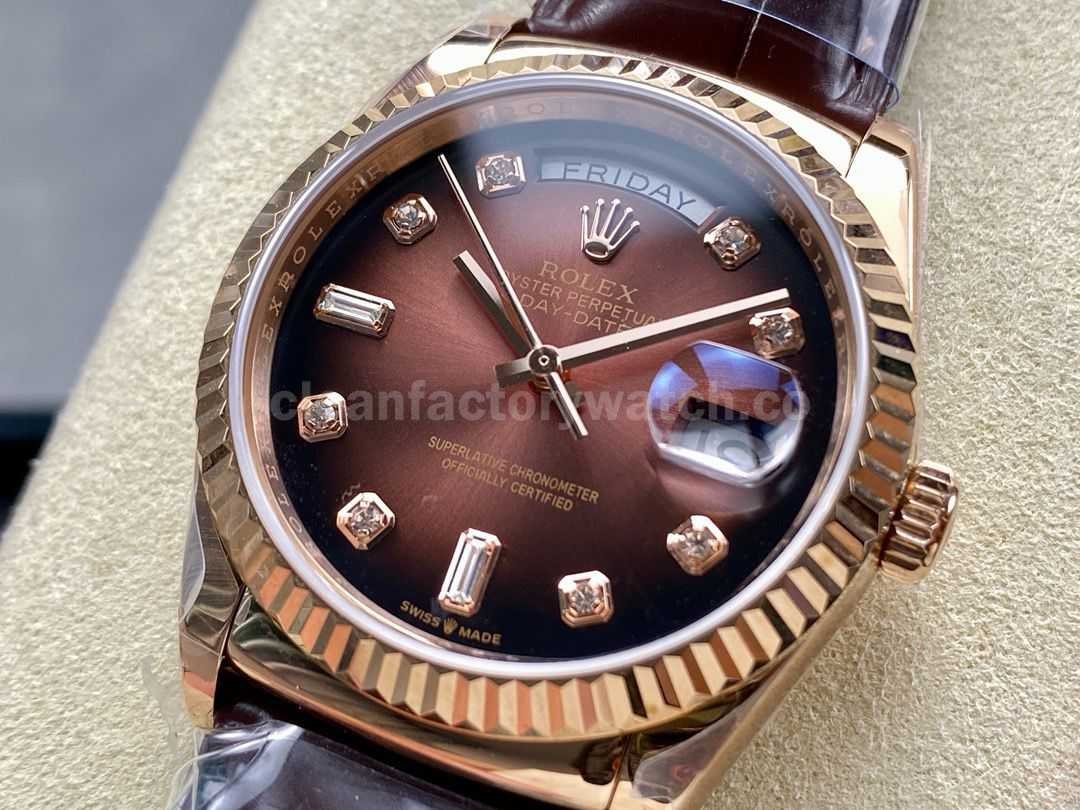 8+ Factory Counterweight Rolex Day-Date 36mm 128235-0037 Rose Gold Crocodile Leather Strap Diamond Mope Baguette Diamond Brown Ombré Dial