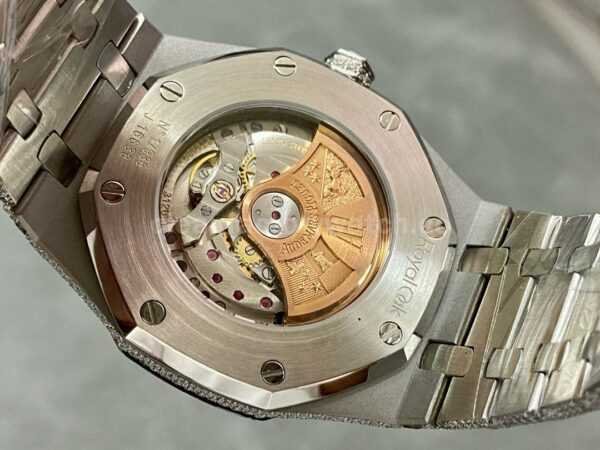 A truly exceptional watch is not only about aesthetics but also about the movement within. The AMG 15400 Full Diamond is powered by a 9015 movement modified to resemble the CAL.3120, ensuring accurate timekeeping and robust power reserve, all while maintaining a slim profile for enhanced wearing comfort.