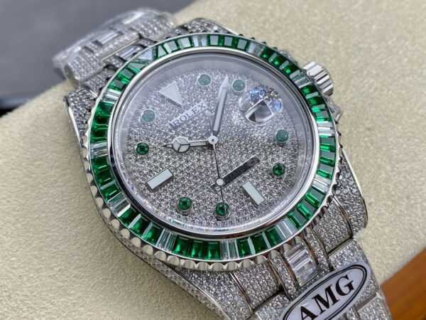 Ultimate luxury, dazzling brilliance! AMG proudly presents this exclusive custom timepiece, meticulously crafted with full diamond embellishment to recreate the opulence of the Rolex Submariner. The entire watch is adorned with top-grade Swarovski diamonds, radiating an exquisite glow that embodies noble prestige. A true symbol of status, this masterpiece allows you to experience high-end horology at an exceptional value!