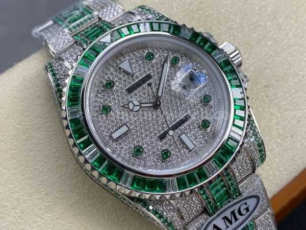 Ultimate luxury, dazzling brilliance! AMG proudly presents this exclusive custom timepiece, meticulously crafted with full diamond embellishment to recreate the opulence of the Rolex Submariner. The entire watch is adorned with top-grade Swarovski diamonds, radiating an exquisite glow that embodies noble prestige. A true symbol of status, this masterpiece allows you to experience high-end horology at an exceptional value!