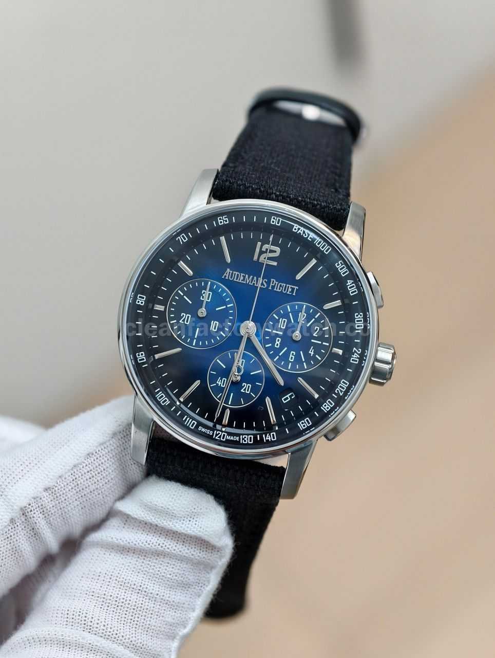 The Audemars Piguet CODE 11.59 Chronograph with blue dial features an automatic flyback movement and a 41mm case, a versatile size that suits both men and women. Its unique case design—merging octagonal and round shapes—sets this collection apart from conventional round watches.