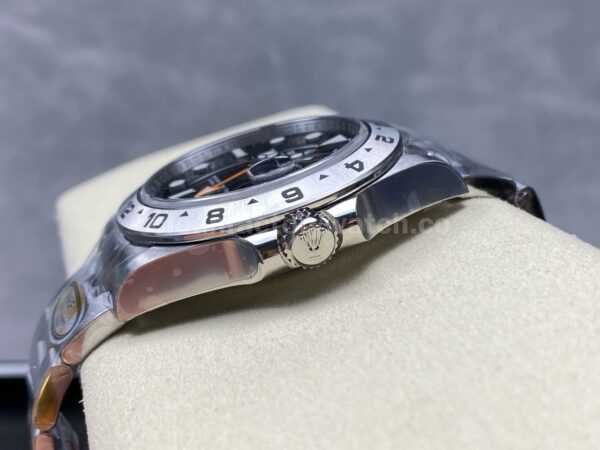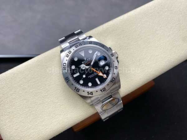 The watch features a fixed bezel with a finely brushed surface, contrasting with the polished case to enhance its visual appeal. The dial follows the classic Explorer II design, highlighted by a bold orange GMT hand that stands out against the black dial, ensuring excellent readability. Both the hour markers and hands are coated with Swiss-imported luminous material, guaranteeing clear visibility even in low-light conditions.