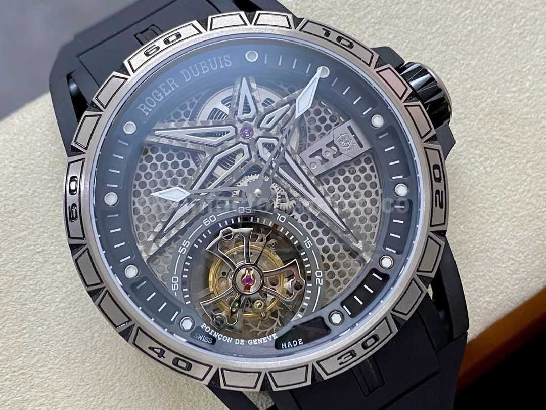3. Dial: It uses a hollow dial, luminous scales, and the black DLC-coated titanium alloy seconds dial is printed with a black minute circle and the words Roger Dubuis. The hands are covered with luminous coating, making reading simple and clear.