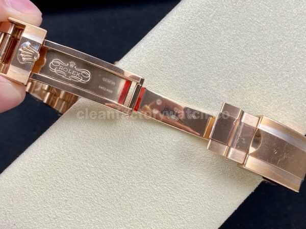 The watch comes with a 904L stainless steel Oyster bracelet plated in 18K gold, finely polished and perfectly integrated with the case. The clasp features CNC-engraved Rolex markings, with clear depth and polished inner finishing, achieving a true 1:1 effect.