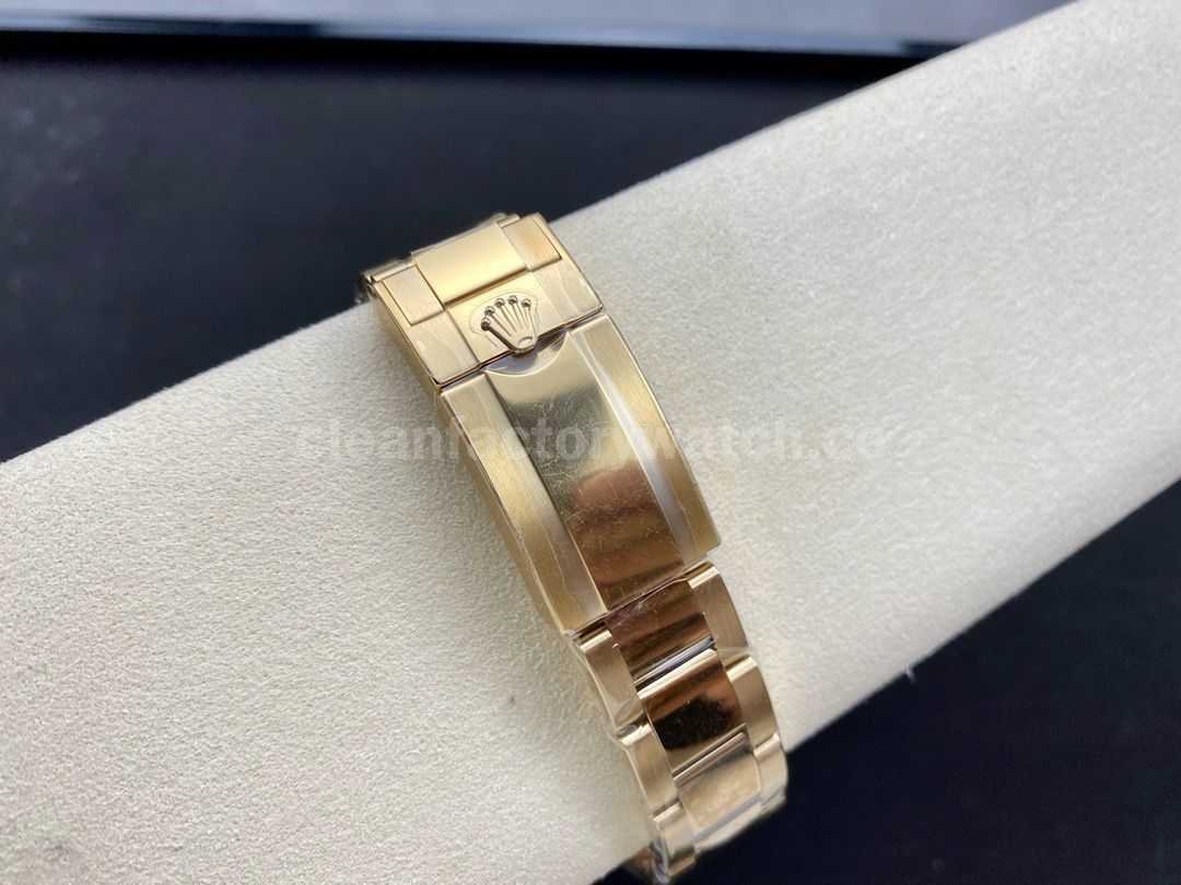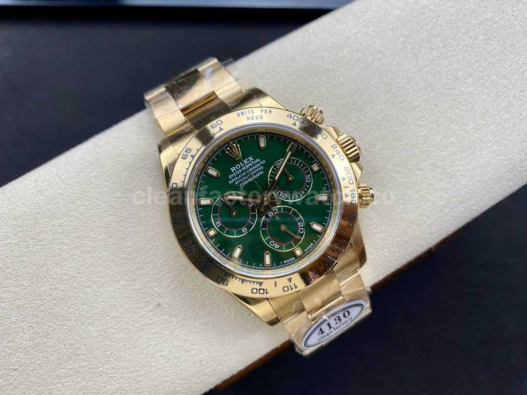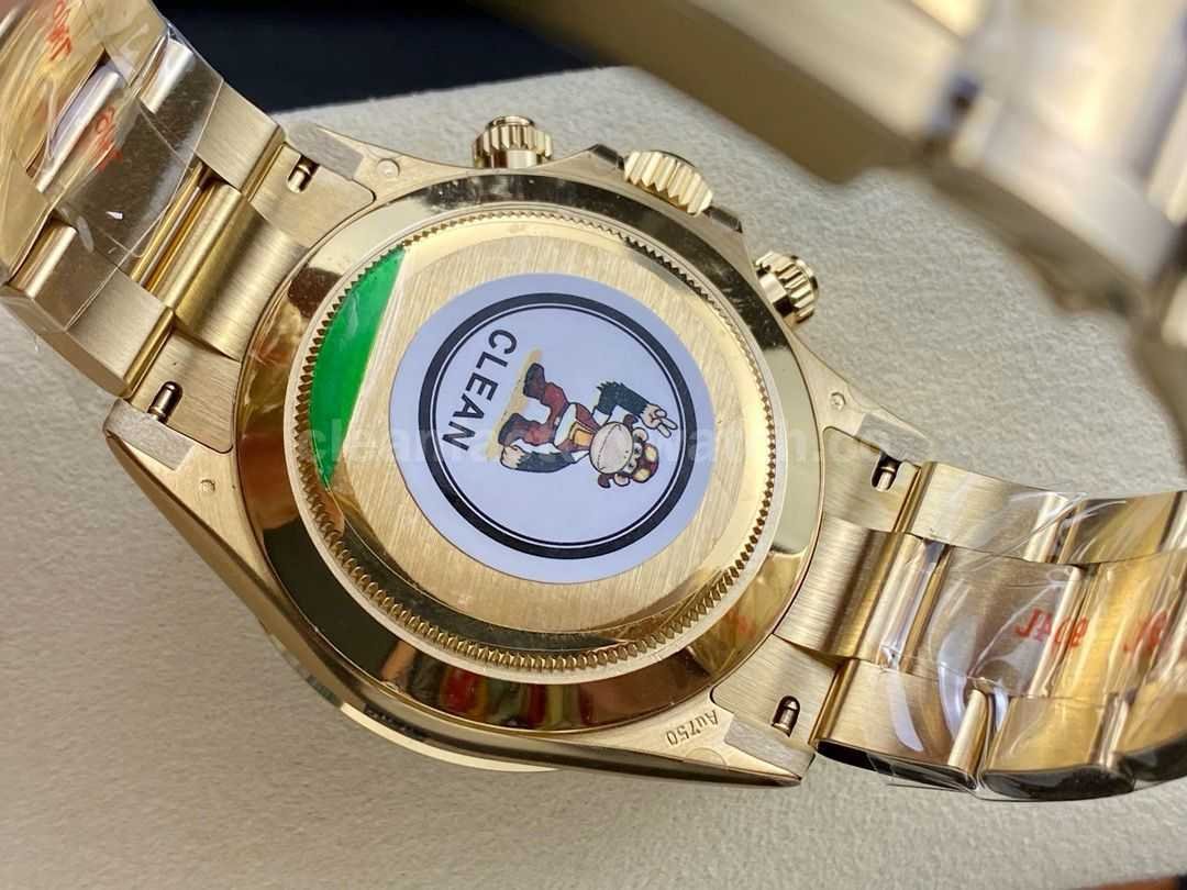 The Clean Factory Rolex Daytona 126508 is crafted from 904L stainless steel with premium 18K gold plating, delivering the same luxurious shine and durability as the genuine model. The golden tone is rich yet elegant, with the case and bracelet carefully polished and brushed to replicate the original’s refined finish. Its corrosion resistance and luster match Rolex standards, ensuring both beauty and longevity.