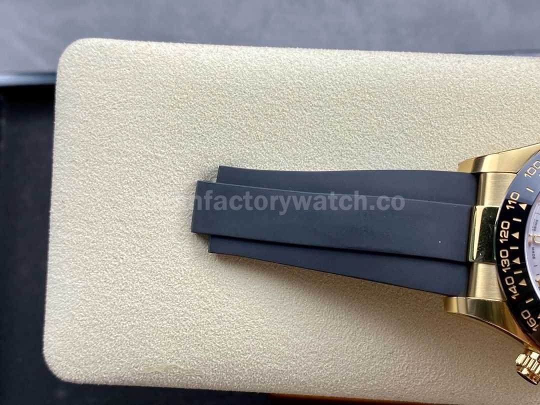 • The tachymeter bezel features deep and precise engravings, with bold numerals filled in black enamel. The fonts, thickness, and spacing are executed to perfection, making it indistinguishable from the genuine reference 116509.