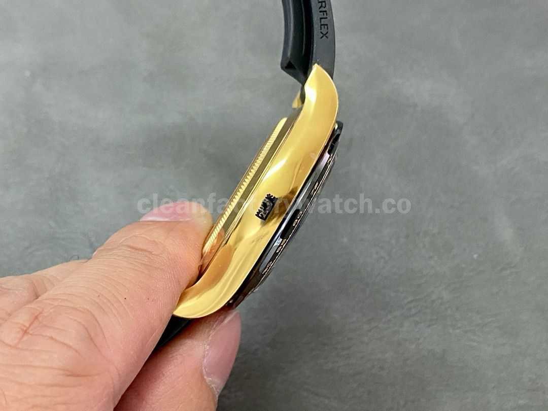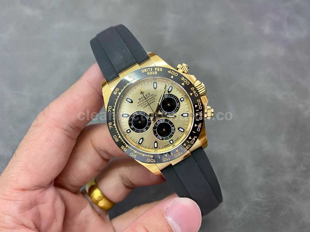 The Clean Factory Rolex Daytona 116518LN is a masterpiece that combines sporty elegance with luxurious aesthetics. The case is made of 904L stainless steel with 18K gold plating, delivering the same warm golden tone as the genuine model. The black ceramic bezel features deeply engraved tachymeter numerals with sharp, three-dimensional details, perfectly replicating the authentic look and feel.
