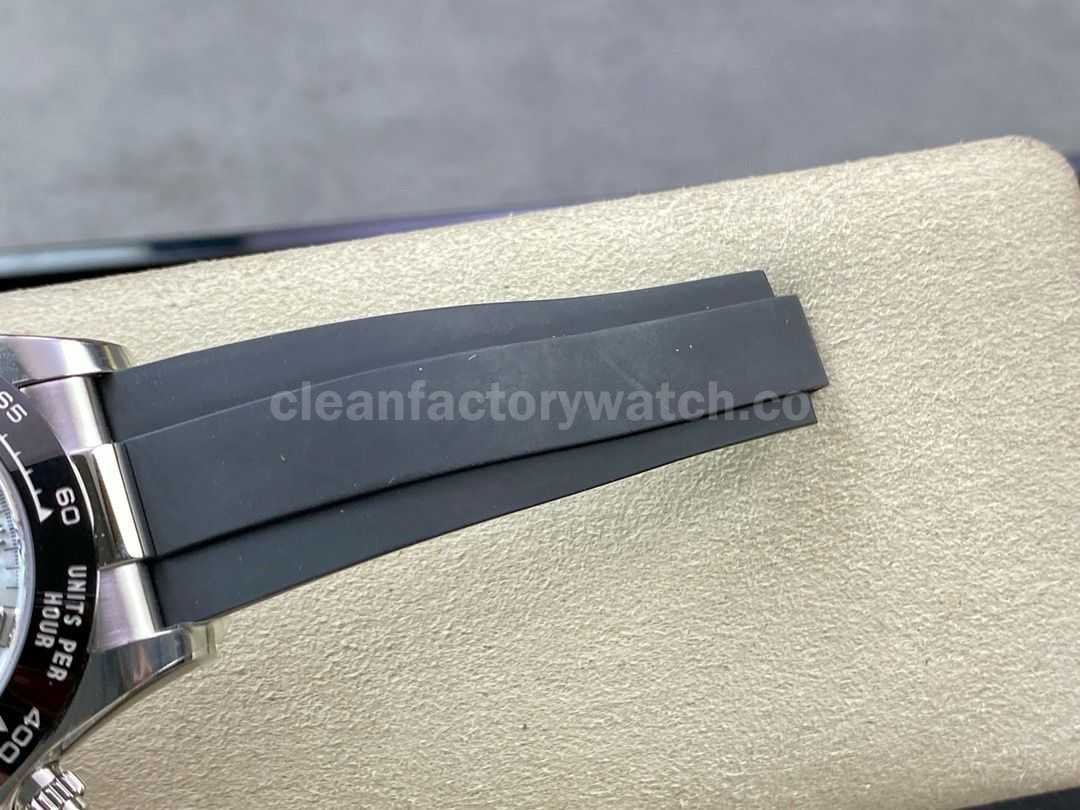 The Clean Factory Rolex Daytona 116519LN is one of the finest 1:1 super clones available today. Featuring a 904L stainless steel case, black Cerachrom ceramic bezel, sunburst gray dial, and Oysterflex rubber strap, it is powered by the integrated Cal.4130 movement. Every detail has been meticulously replicated to match the genuine Rolex Daytona.