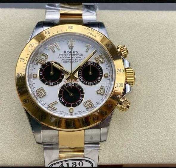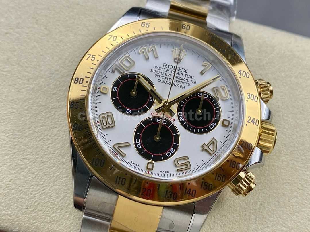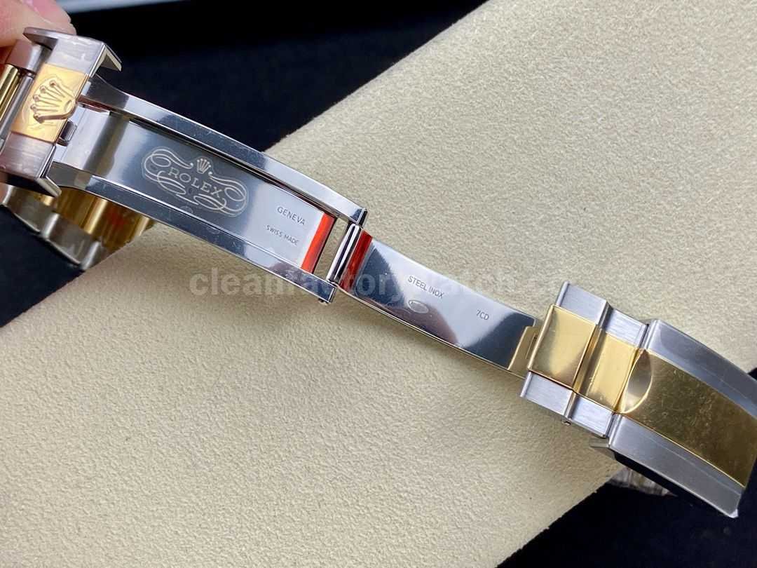 The Clean Factory Rolex Daytona 116523 is crafted from premium 904L stainless steel combined with high-quality gold plating, presenting a distinctive two-tone design. The case and bracelet alternate between polished and brushed finishes, creating a refined metallic texture. The gold bezel and center links are produced using multiple electroplating processes, delivering a rich, long-lasting luster that closely mirrors the genuine model.