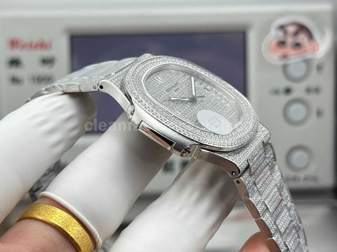 A: The real highlight is not just the full-pavé appearance, but whether the 40mm case, 8.3mm thickness, integrated bracelet, and full-diamond execution still work together as a proper Nautilus.
