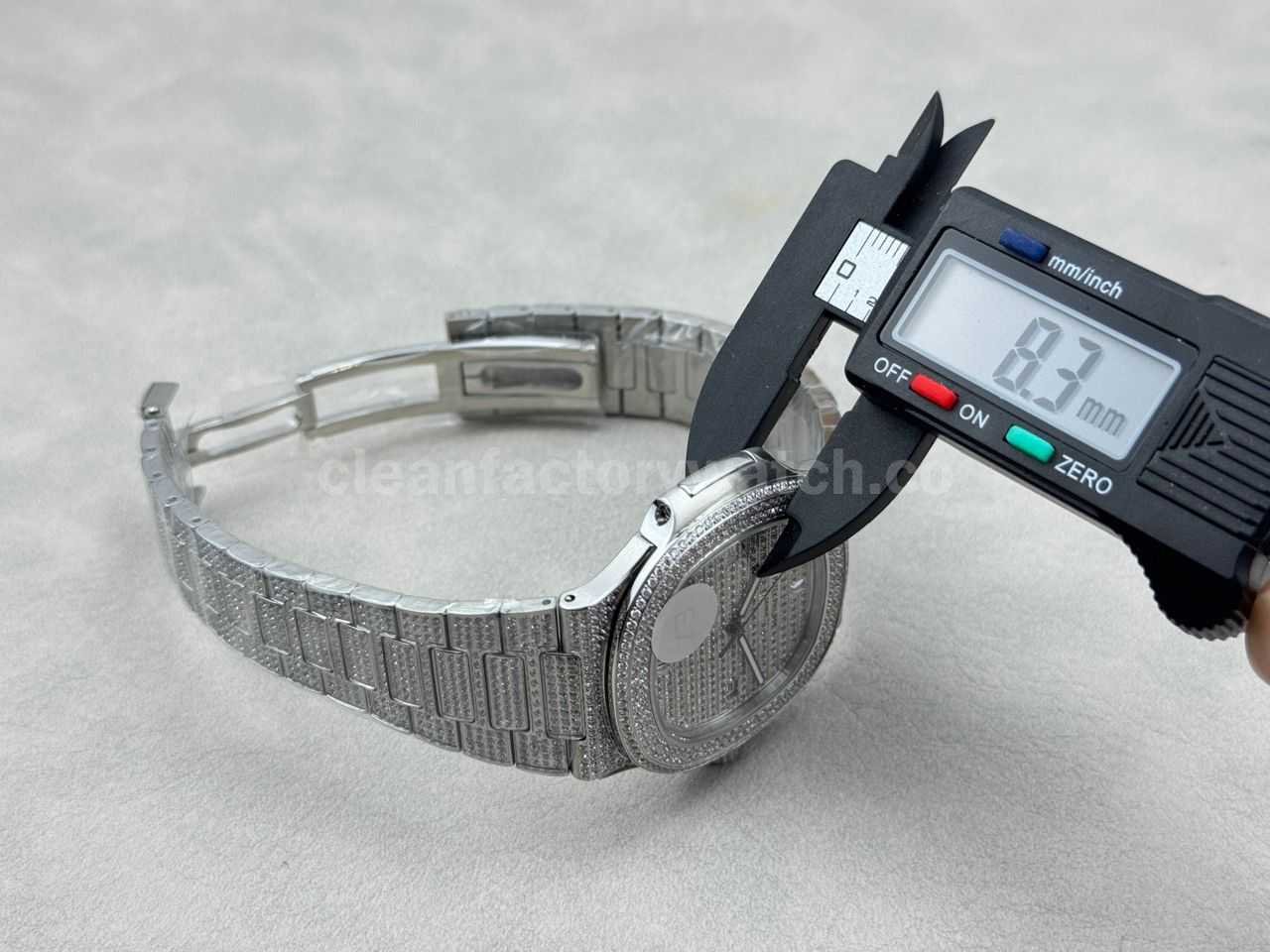 2. The 40mm size and 8.3mm thickness matter more here than most people think, because a full-diamond Nautilus still depends on proportion to avoid looking heavy