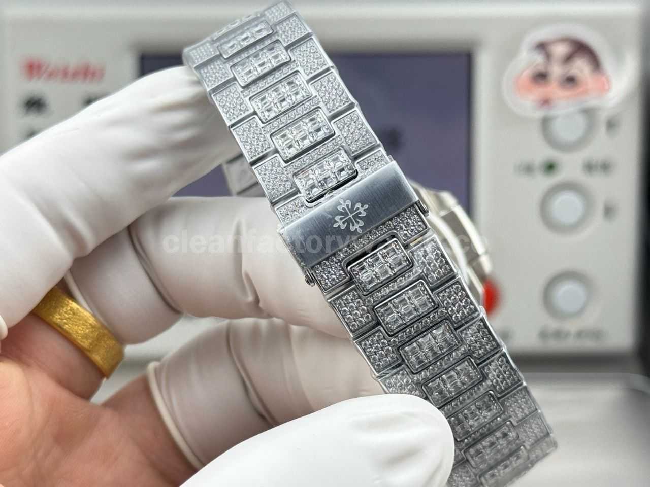 That is the real standard for this E7 Factory Patek Philippe 5711 full diamond replica. The important question is not just whether the stones look bright in photos, but whether the watch still keeps the clean, flat, integrated character that makes the 5711 so recognizable. Its obvious strength is visual presence. Its obvious risk is that full-diamond designs can easily cross the line from luxurious to messy if the structure underneath is not disciplined enough.