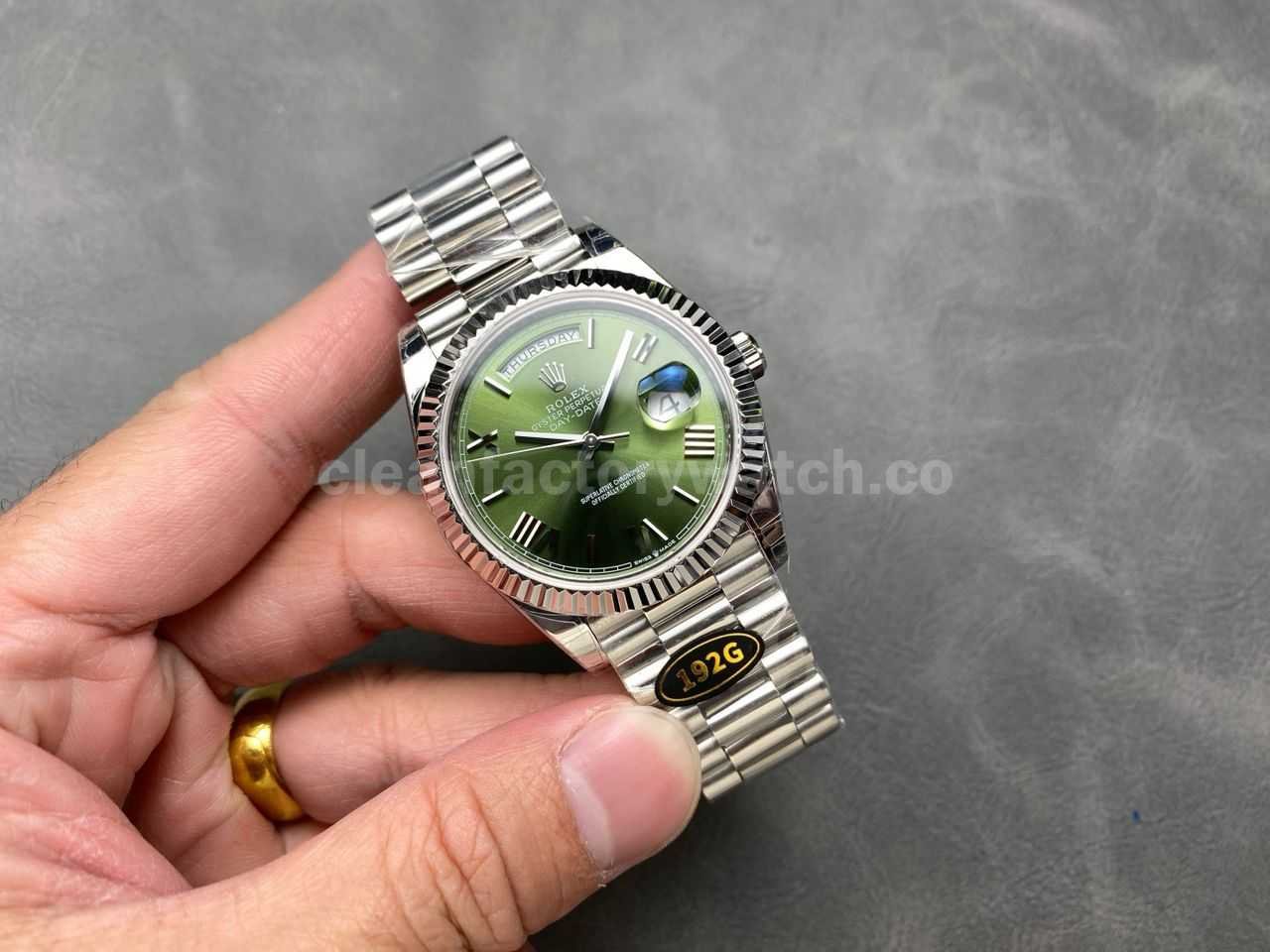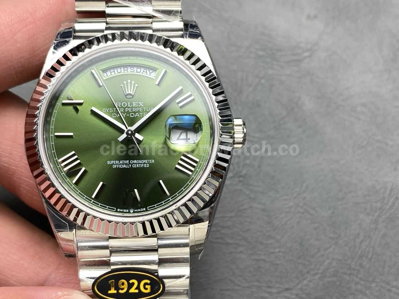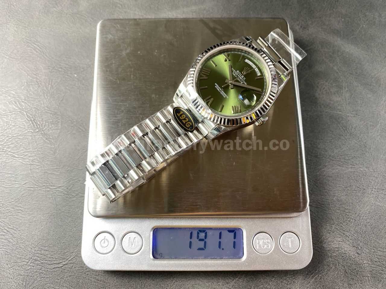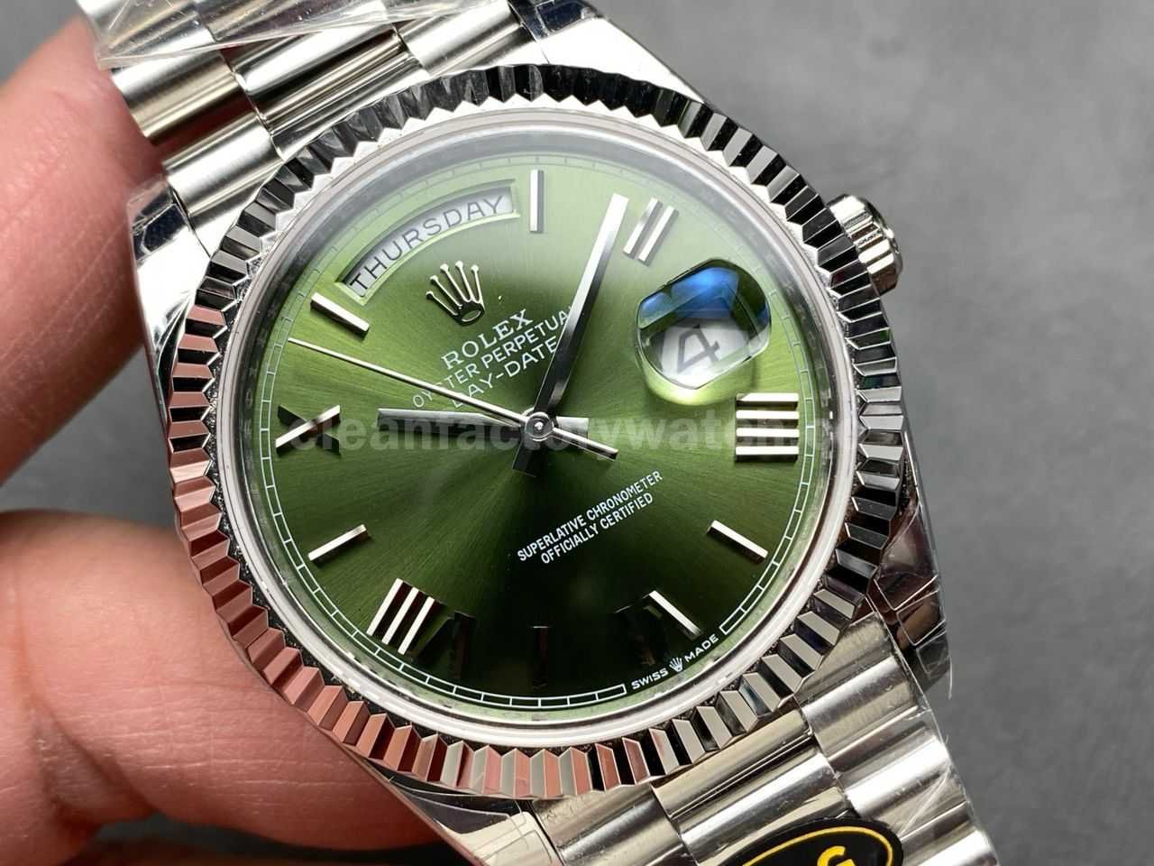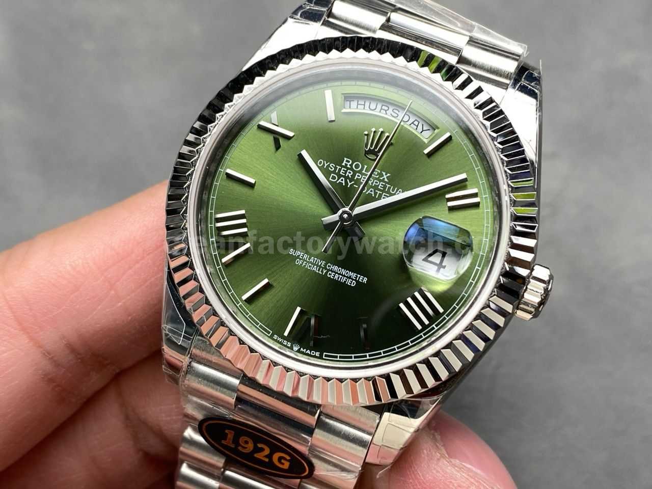 KF Factory Counterweight Rolex Day-Date 228239-0033 40mm Full White Gold Roman Numerals Avocado Green Dial 3255 Movement