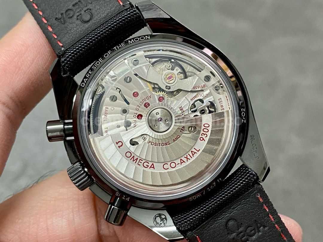 •Powered by a replica version of the Omega 9300 automatic chronograph movement. (Note: Although the movement is not visible in this image, OM Factory versions typically have a movement layout closely mimicking the genuine 9300, including the balance wheel position.)
