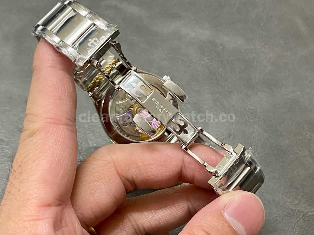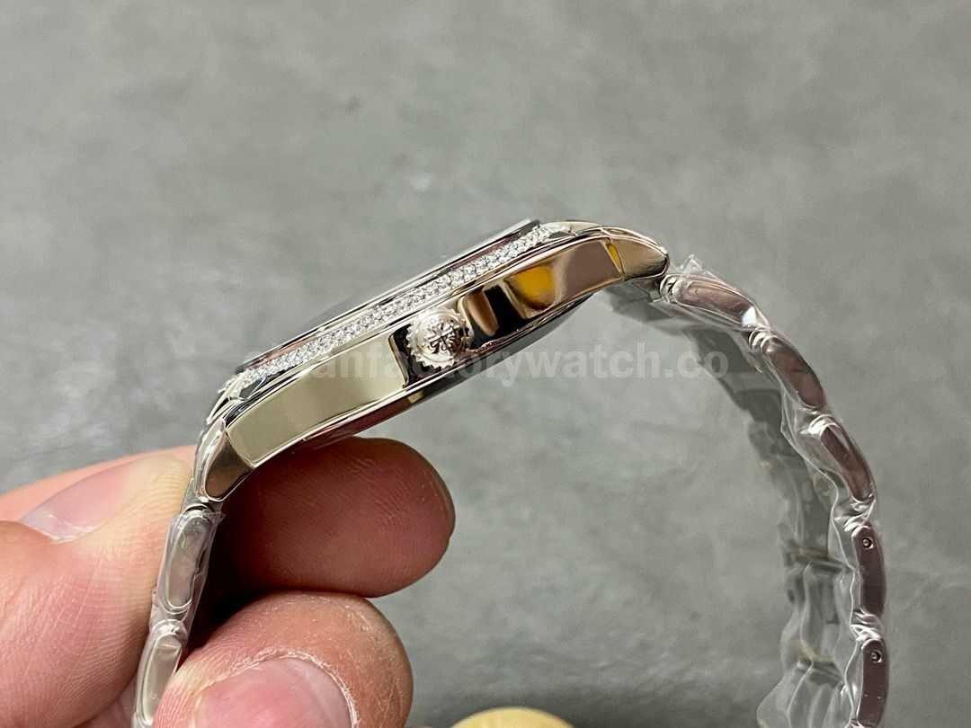 Crafted using molds developed from genuine Patek Philippe samples, the case is formed through high-tonnage cold stamping and meticulously polished to perfection. Retaining the aesthetic charm of the original rectangular Twenty~4 series, the new 36mm round case features Patek Philippes patented Calatrava-style fold-over clasp for easy wear. The center links of the bracelet are slightly raised, seamlessly integrated with the dual-layer side links and case. The bezel gracefully curves and rises at the 12 and 6 o’clock positions, set with precisely placed diamonds. Together with the domed sapphire crystal, it forms a beautifully sculpted tonneau-shaped profile.