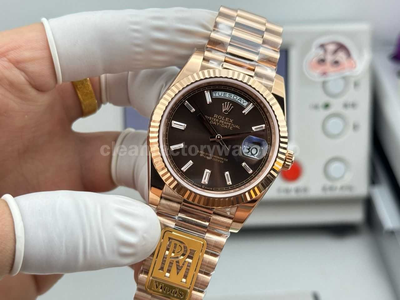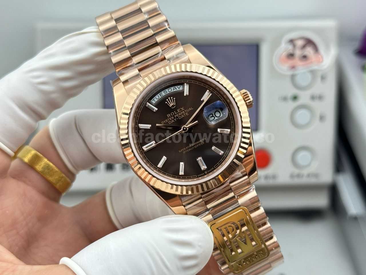 PPM Factory Counterweight Rolex Day-Date 228235-0003 40mm Full Rose Gold Baguette Diamond Brown Dial