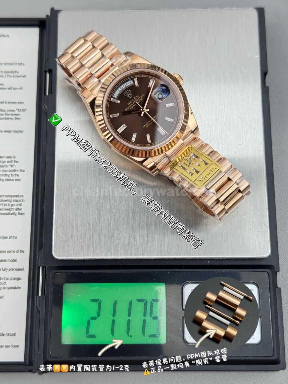 From bracelet colors and dial variations to total weight and case thickness, every detail is developed against the authentic Rolex Day-Date — redefining what a true weighted DD should be.