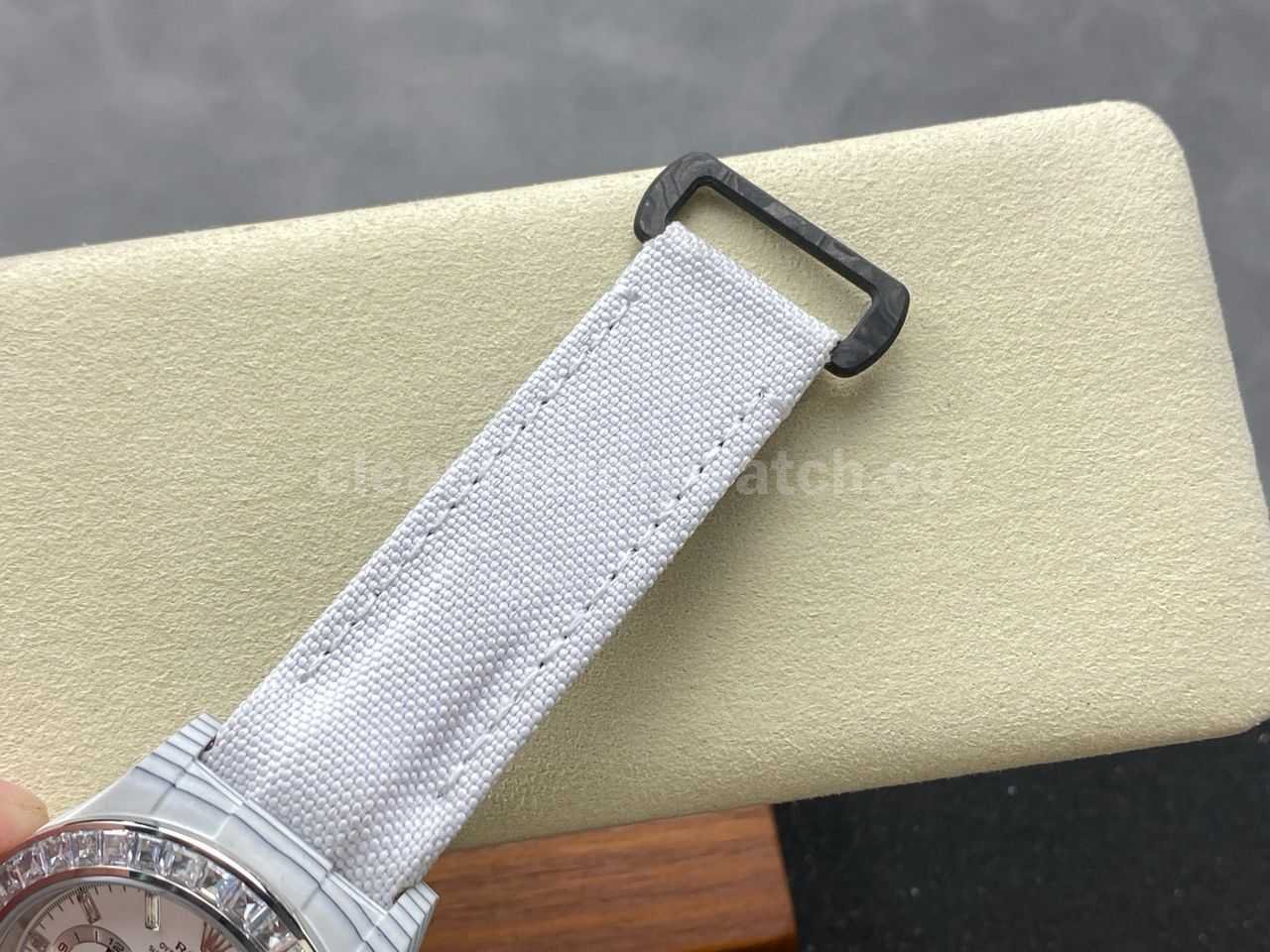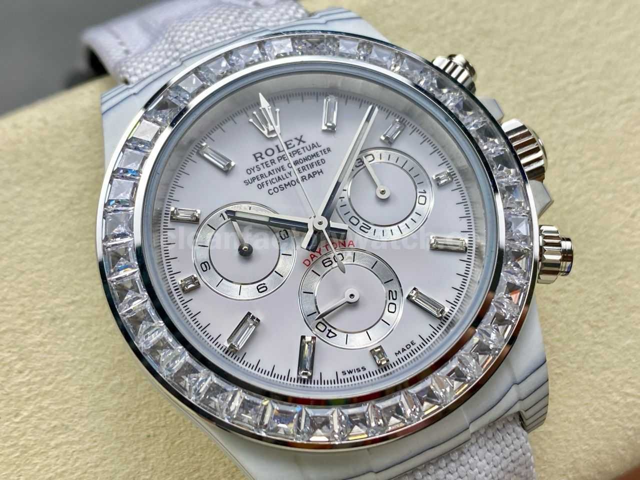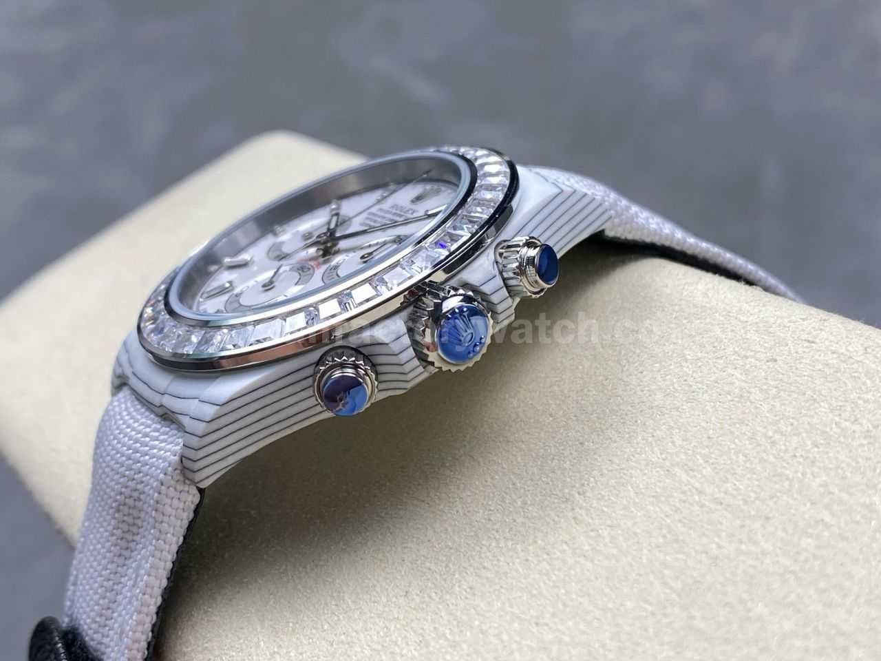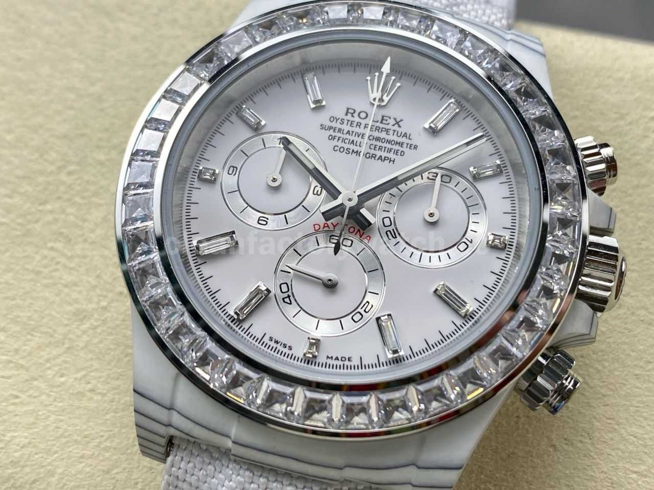 PPM Factory Rolex Daytona Modified 116500 White Carbon Fiber Calf Skin Strap Diamond Baguette White Dial
