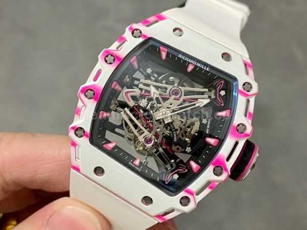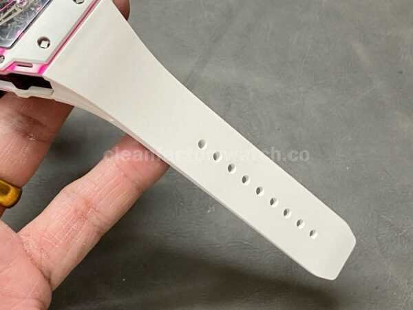 Equipped with RM 38-02 manual winding movement, with a swing frequency of 28800vph and a power reserve of 52 hours. This movement uses carbon fiber to make a hollow bottom plate, which has excellent shock resistance. The bridge plate is still made of solid grade 5 titanium, and the small holes on the back are also decorated with pink elements.