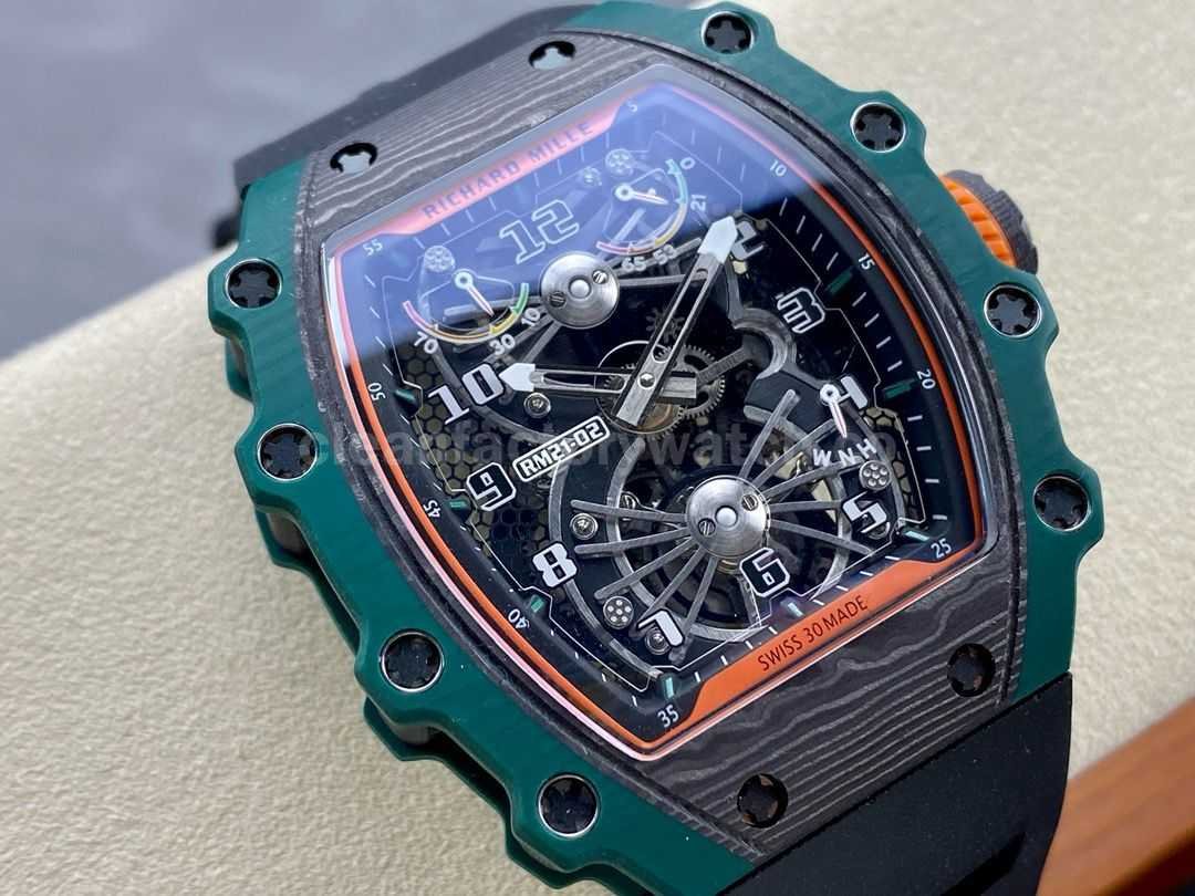 This is one of RICHARD MILLE’s most complex watch cases to date – the bezels on both sides and the case back are made of green Quartz TPT quartz fiber, the front and side pillars of the case are made of Carbon TPT carbon fiber, and the middle case is made of 5 Made of high-grade titanium alloy, it shows a rich sense of the future.