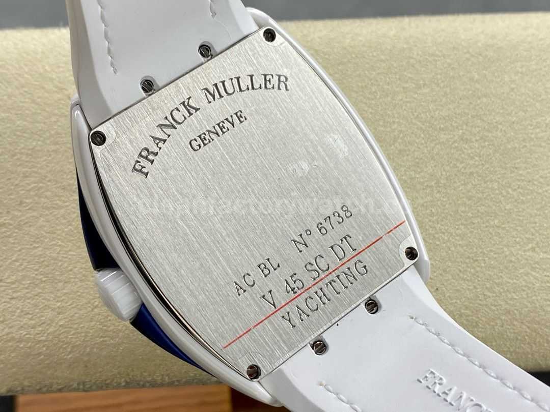 The Franck Muller V45 Ceramic Yacht Edition stands out with its finely crafted ceramic case, precisely molded numeral indices, comfortable dual-layer strap, and reliable Miyota 9015 movement. It seamlessly blends luxury with practicality, making it a perfect choice for both business settings and casual outings.