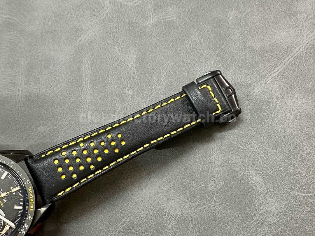 Black perforated leather strap with a yellow inner lining, highly accurate to the original.
