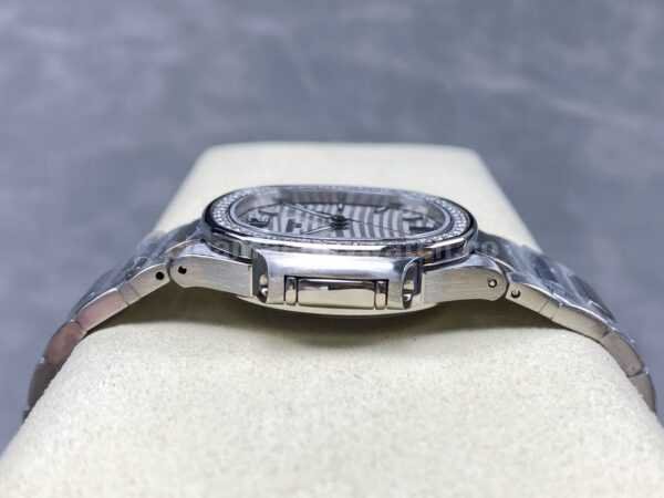Measuring 35.2mm, the Nautilus case features distinctive side contours. The bracelet showcases a harmonious blend of brushed and polished surfaces, with each edge finely chamfered and polished into a smooth arc. The integration between lugs and bracelet is seamless, ensuring a comfortable and elegant fit on the wrist.