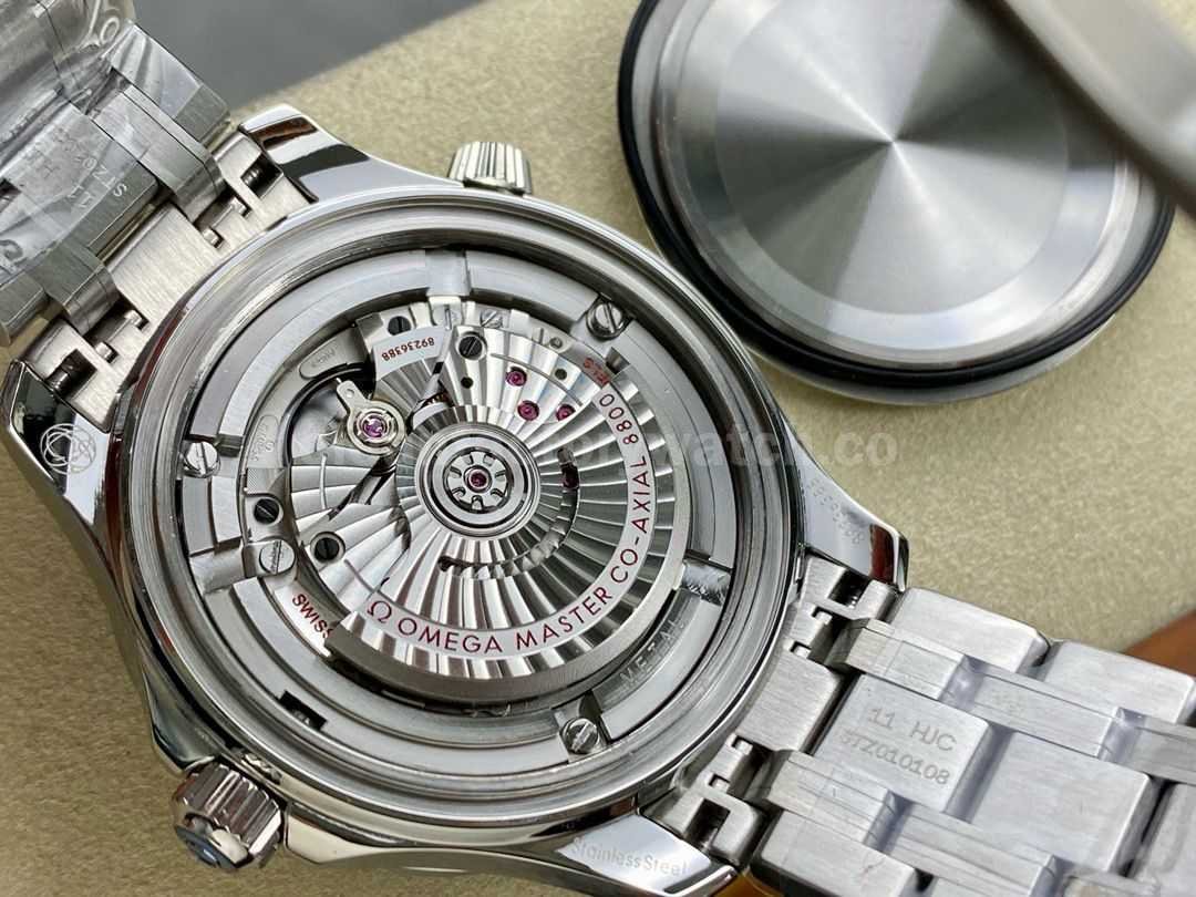 Powered by VS Factory in-house developed Cal.8800 integrated automatic movement, this watch does away with decorative plates or false bridges. The internal layout is true to the original Omega design, featuring automatic winding, hacking seconds, and quick-set date functions, with a power reserve of up to 55 hours. The transparent case back reveals the intricately working rotor and balance wheel, delivering a visually striking impression.